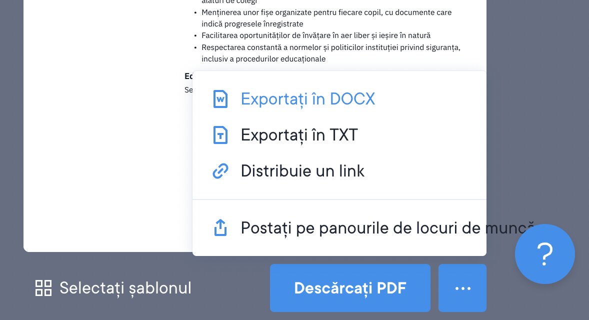 În prezent, folosim o versiune beta a descărcării CV-ului tău în format DOCX și, odată ce am testat-o suficient, actualizarea va fi disponibilă pentru toți utilizatorii noștri. Este o funcție premium care și-ar putea dovedi utilitatea în acele țări în care angajatorii solicită un document Word în loc de PDF. Dacă vrei să folosești această funcție super-utilă, trebuie doar să faci clic pe butonul cu trei puncte de lângă „Descărcare” din creatorul de CV-uri (vezi mai jos).