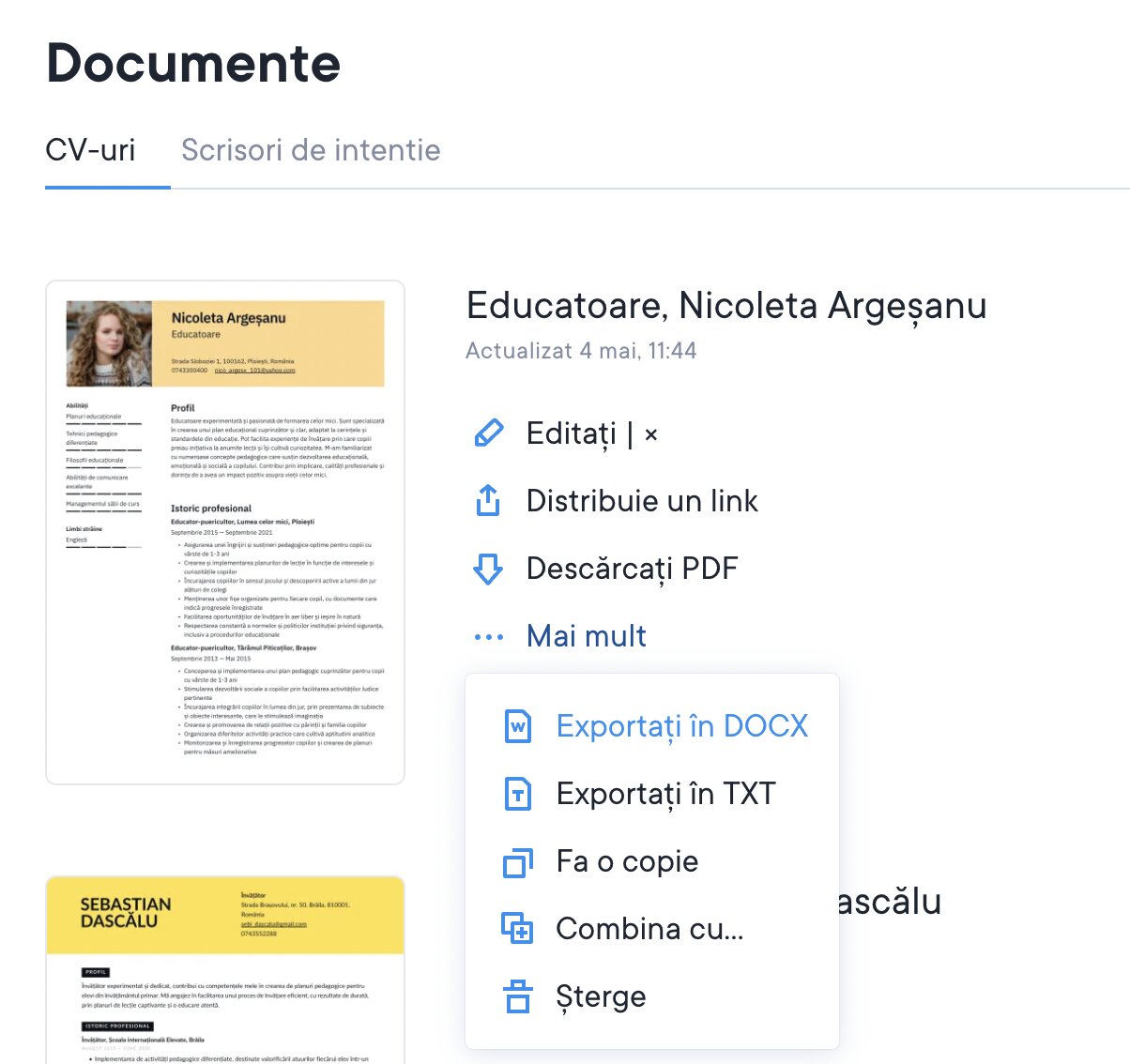 Dacă folosești abonamentul gratuit, poți să exporți CV-ul într-un fișier TXT sau să partajezi linkuri online către CV-ul tău.