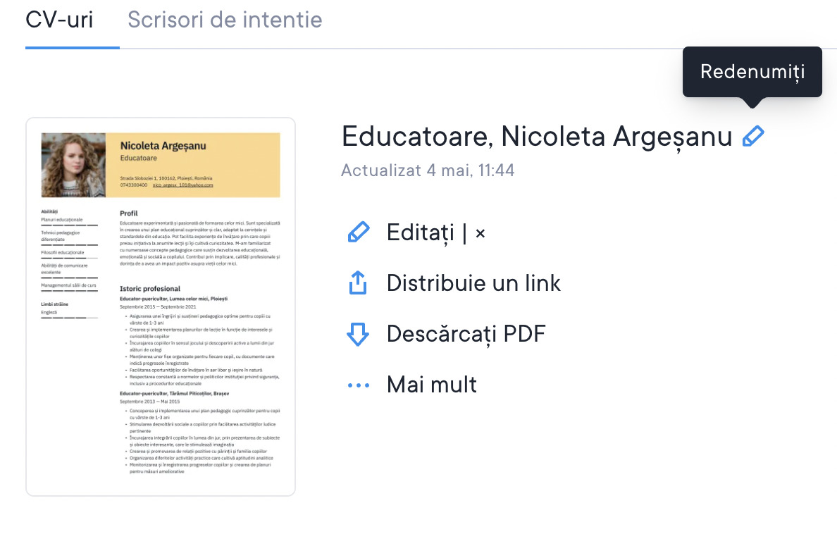 Redenumește întotdeauna versiunile diferite ale CV-ului și ale scrisorii de intenție. Ideea este să le dai denumiri care să te ajute să te organizezi când cauți un loc de muncă. De cele mai multe ori, utilizatorii noștri redenumesc documentele cu titlul postului la care candidează. Ideal este să-ți adaptezi diferite CV-uri și scrisori de intenție pentru diferite candidaturi. Poți redenumi CV-ul și scrisoarea de intenție prin clic pe denumirea documentului din panoul de bord. Vezi imaginile de mai jos.