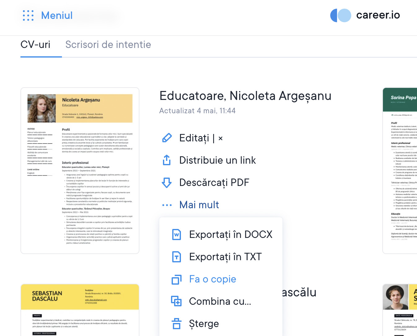 Editarea și gestionarea versiunilor CV-ului și ale scrisorii de intenție în cvapp.ro este cel mai rapid și mai simplu mod de a face acest lucru!