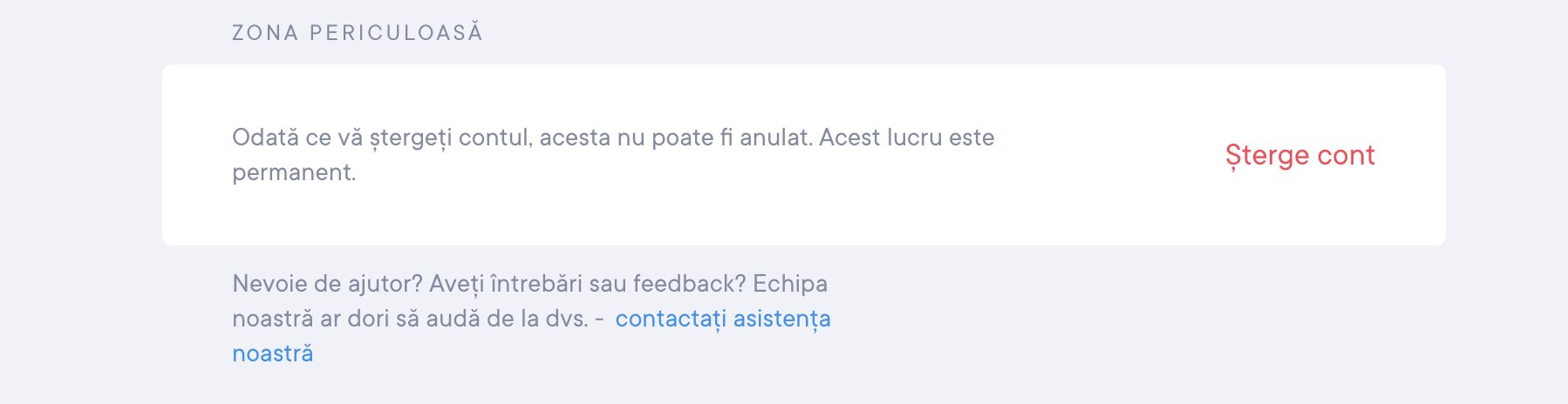 Dacă vrei să îți ștergi contul definitiv, derulează pagina Setări cont până în partea de jos și fă clic pe Șterge contul. Vezi imaginea de mai jos.
